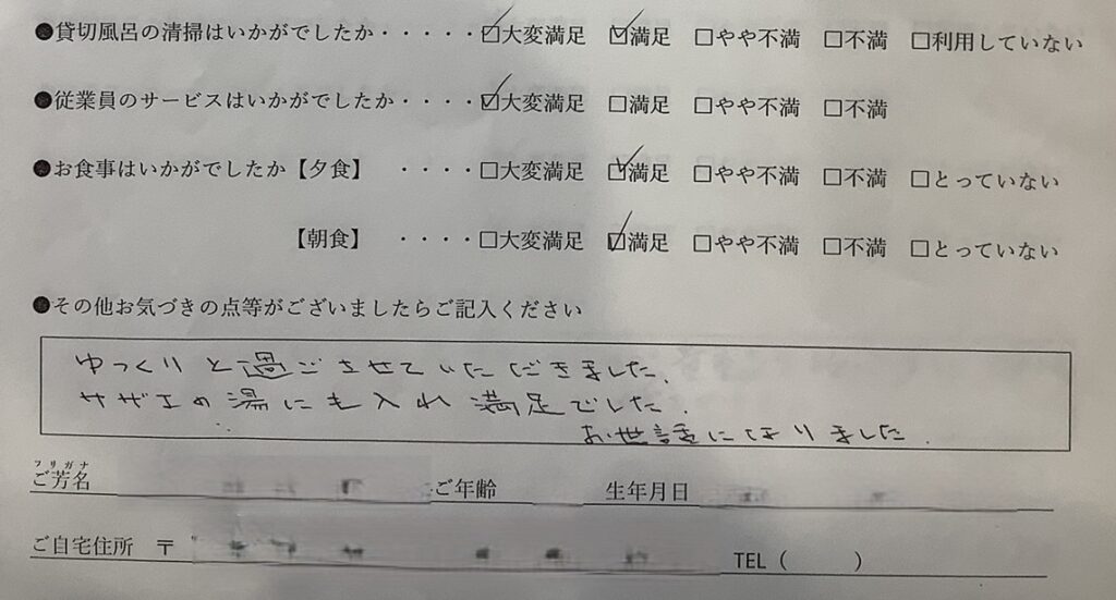 「ゆっくりと過ごさせていただきました。サザエの湯にも入れ満足でした。お世話になりました。」
