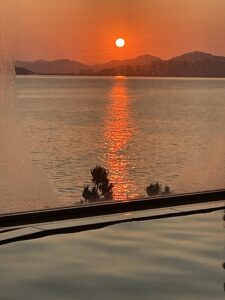 今朝の「悠久の湯」と展望ラウンジから望む朝日は、まるで海に光の道が伸びていくような、どこか遠い昔の情景を思わせるものでした。