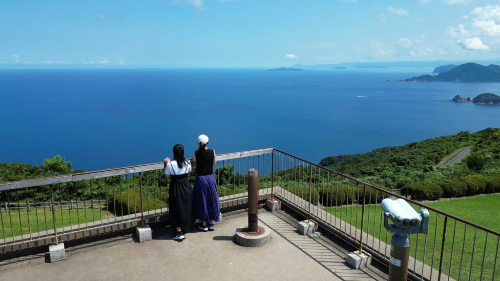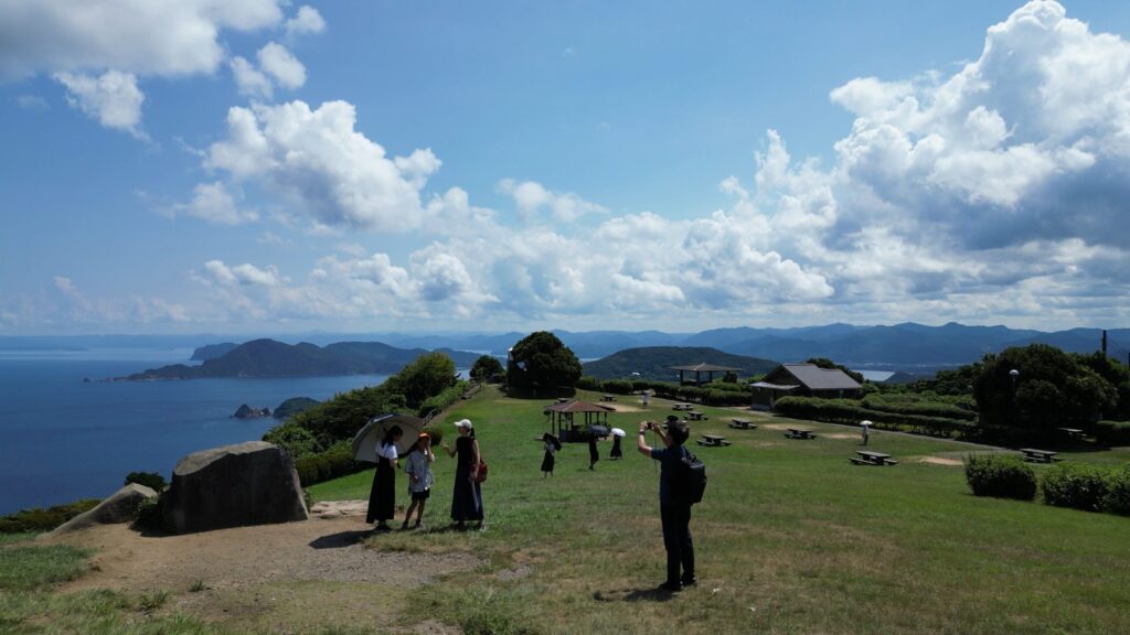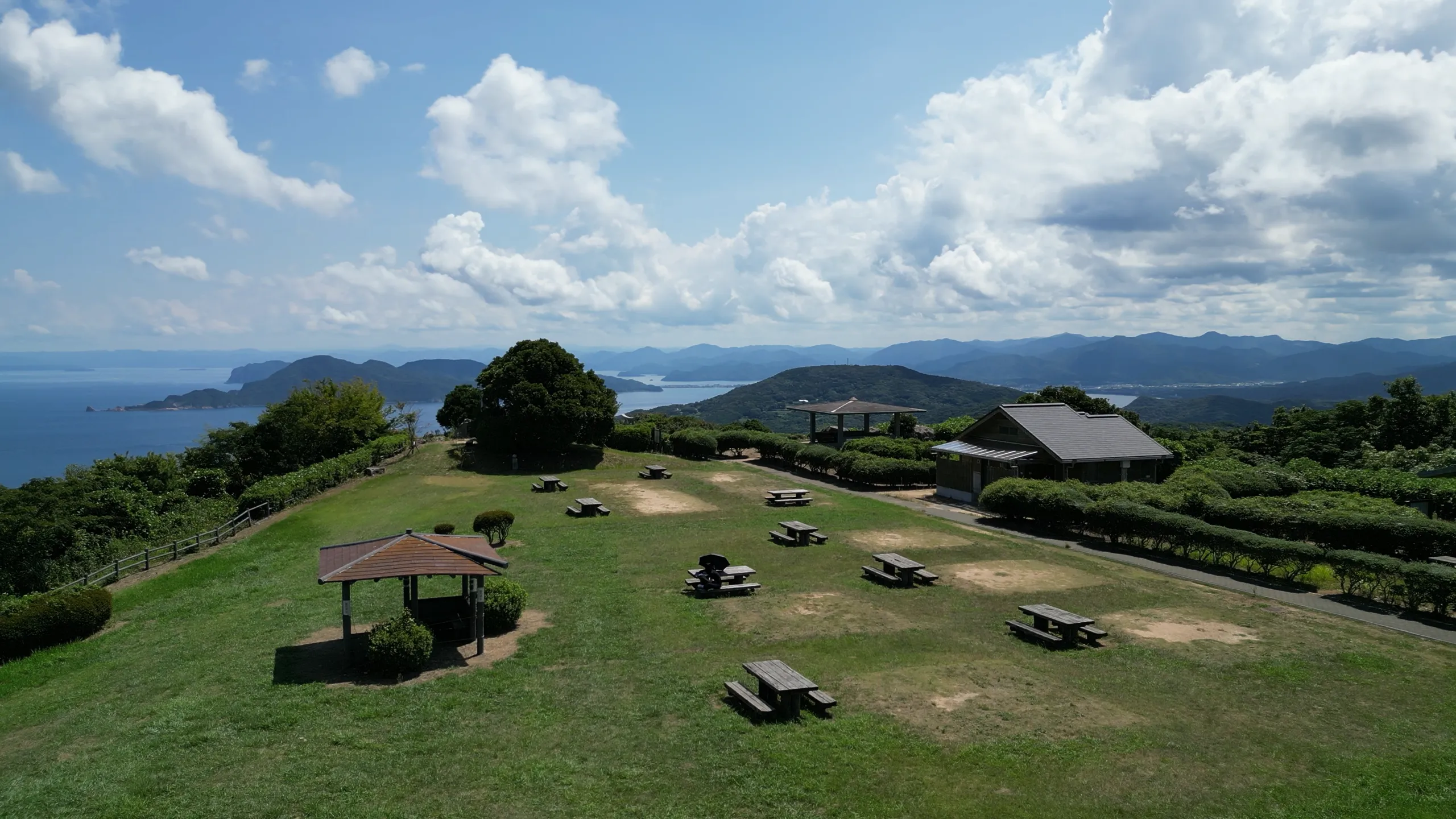 高台を吹き抜ける爽やかな海風が心地よく、眼下には青海島をはじめとする島々の姿。春にはツツジ、夏にはハマユウ、秋にはサザンカが咲き誇り、四季折々の花々が訪れる人を迎えてくれます。