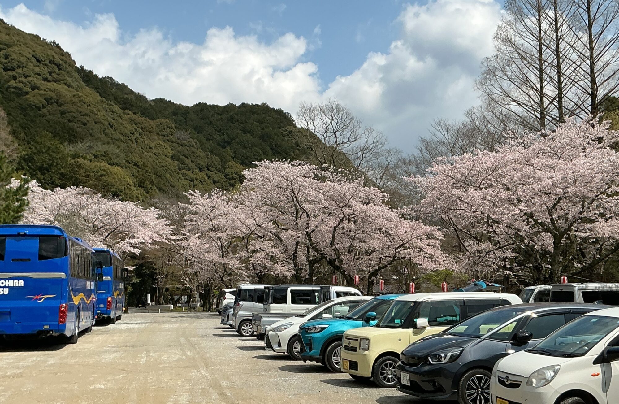 境内一帯が淡い桃色に染まり、観光バスの姿も多く見られるようになりました。